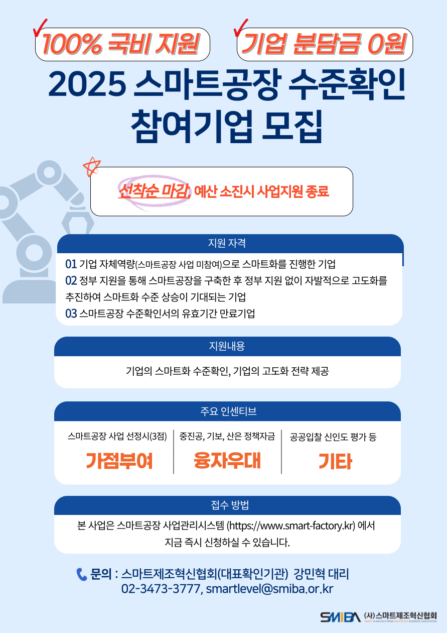 저희는 스마트공장 수준확인 사업 신청을 적극적으로 도와드리고 있습니다. 유효기간 만료가 임박했거나 스마트공장 도입을 고려 중인 기업이라면 예산이 마감되기 전에 서둘러 신청하시기 바랍니다. |