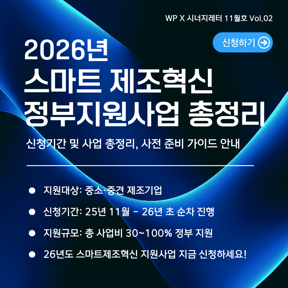 찬바람이 불어오는 11월, 길가에 떨어지는 낙엽을 보며 한 해의 끝을 실감하게 됩니다.🍂 이번 WPX 시너지레터에서는 구독자님들께 2026년도 스마트 제조혁신 정부지원사업 공고 소식을 가장 빠르게 전해드립니다!