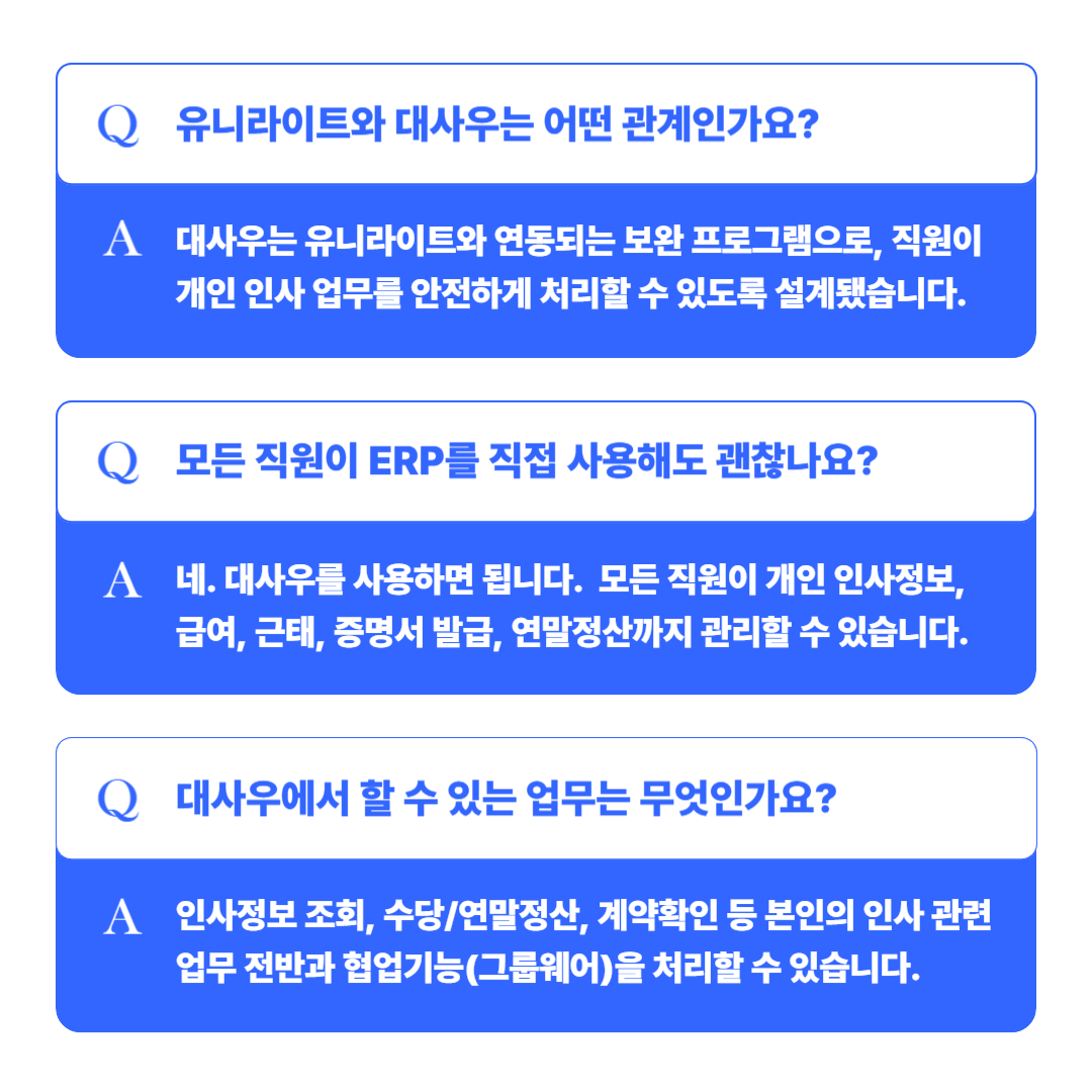 Q. 유니라이트와 대사우는 어떤 관계인가요?A. 대사우는 유니라이트와 연동되는 보완 프로그램으로,