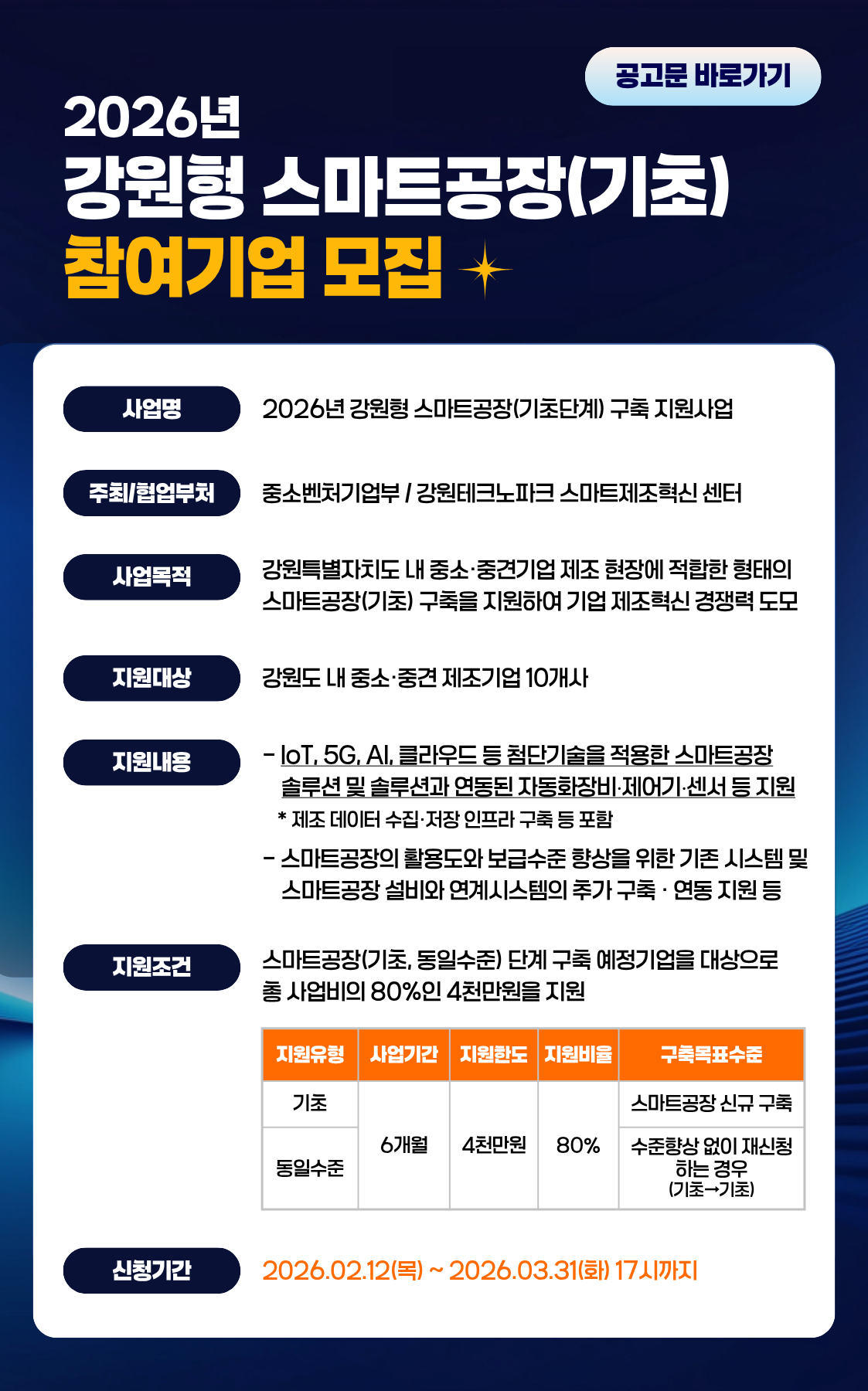 마감이 가까워질수록 준비 기간이 부족해질 수 있습니다. 스마트공장 도입 및 정부지원사업 신청을 고민 중이시라면 전화 또는 이메일 상담을 통해 미리 문의해주시기 바랍니다.